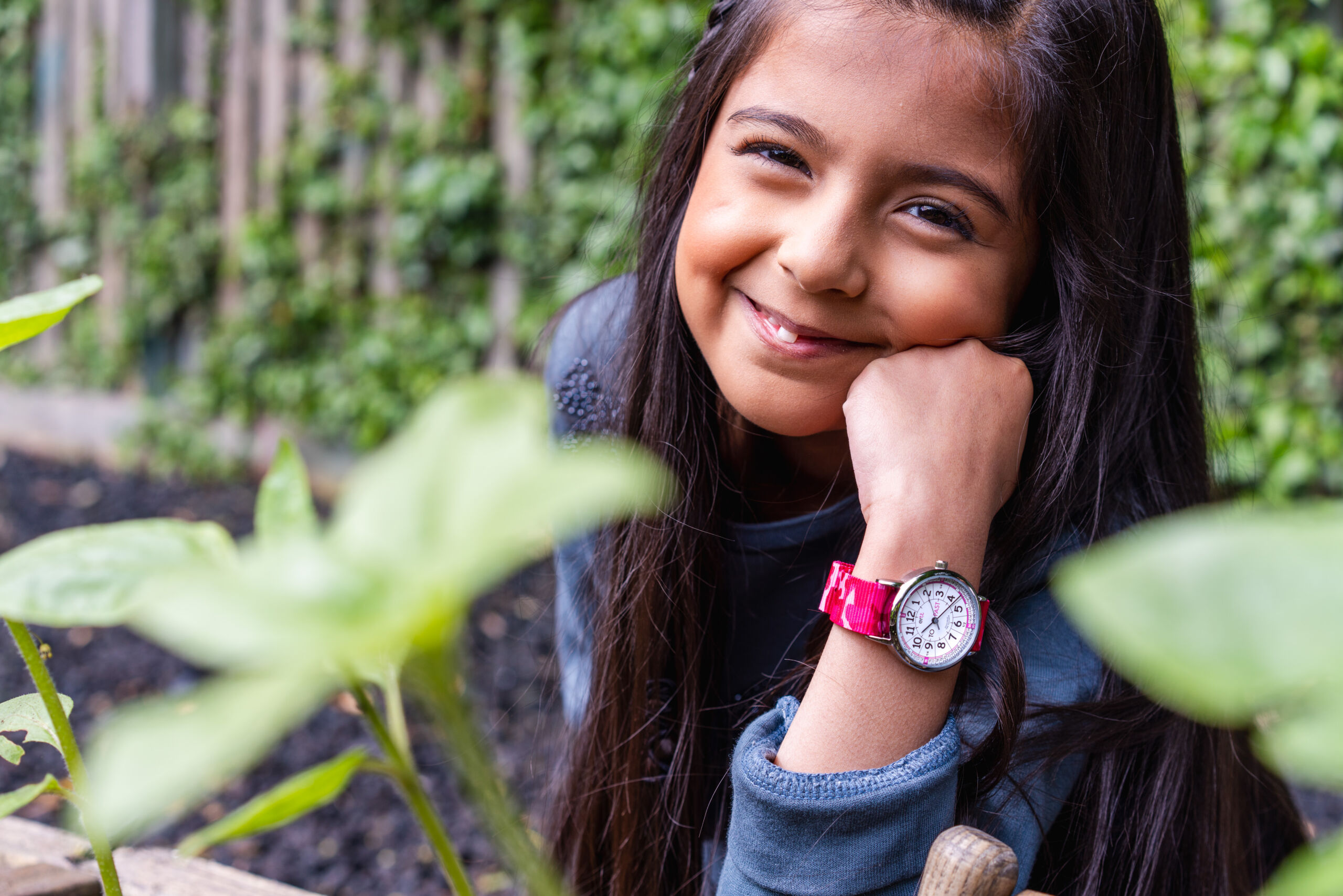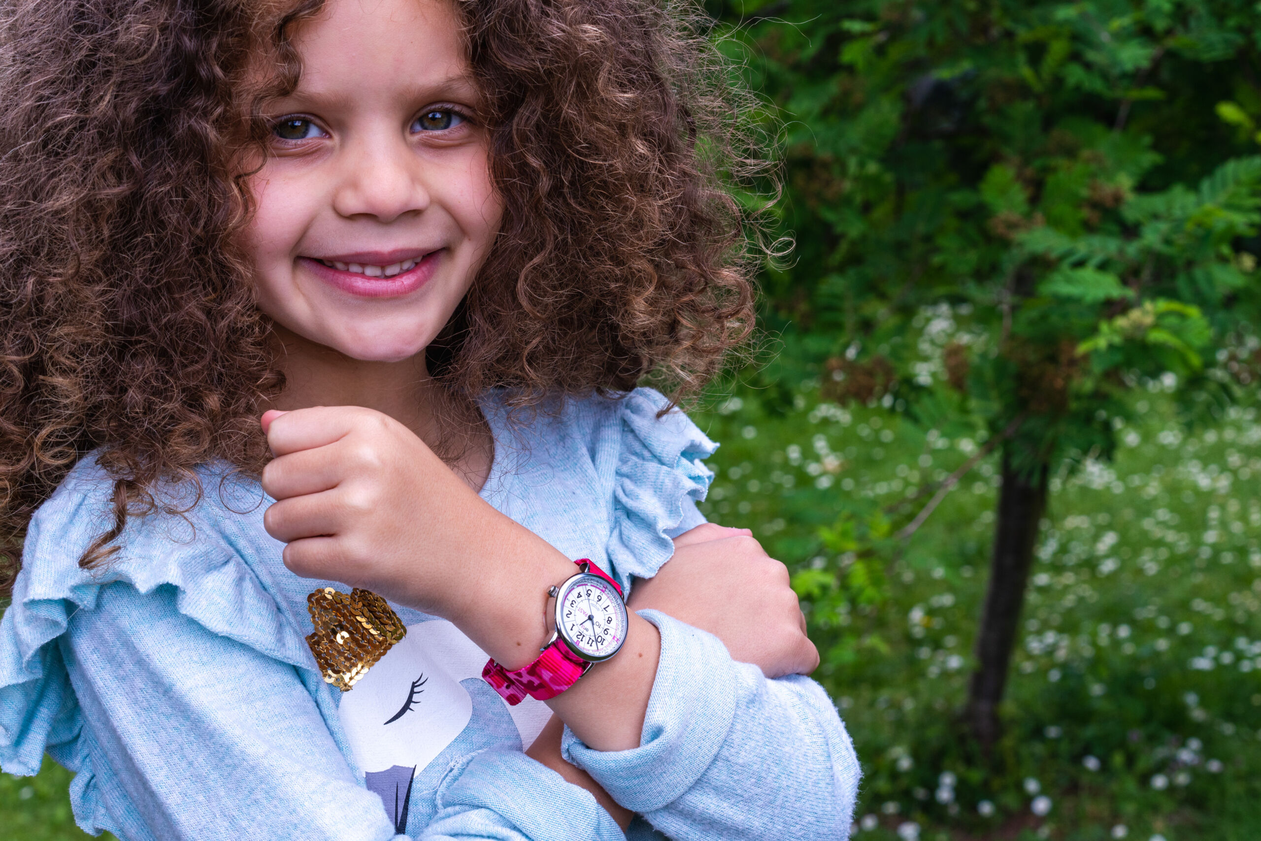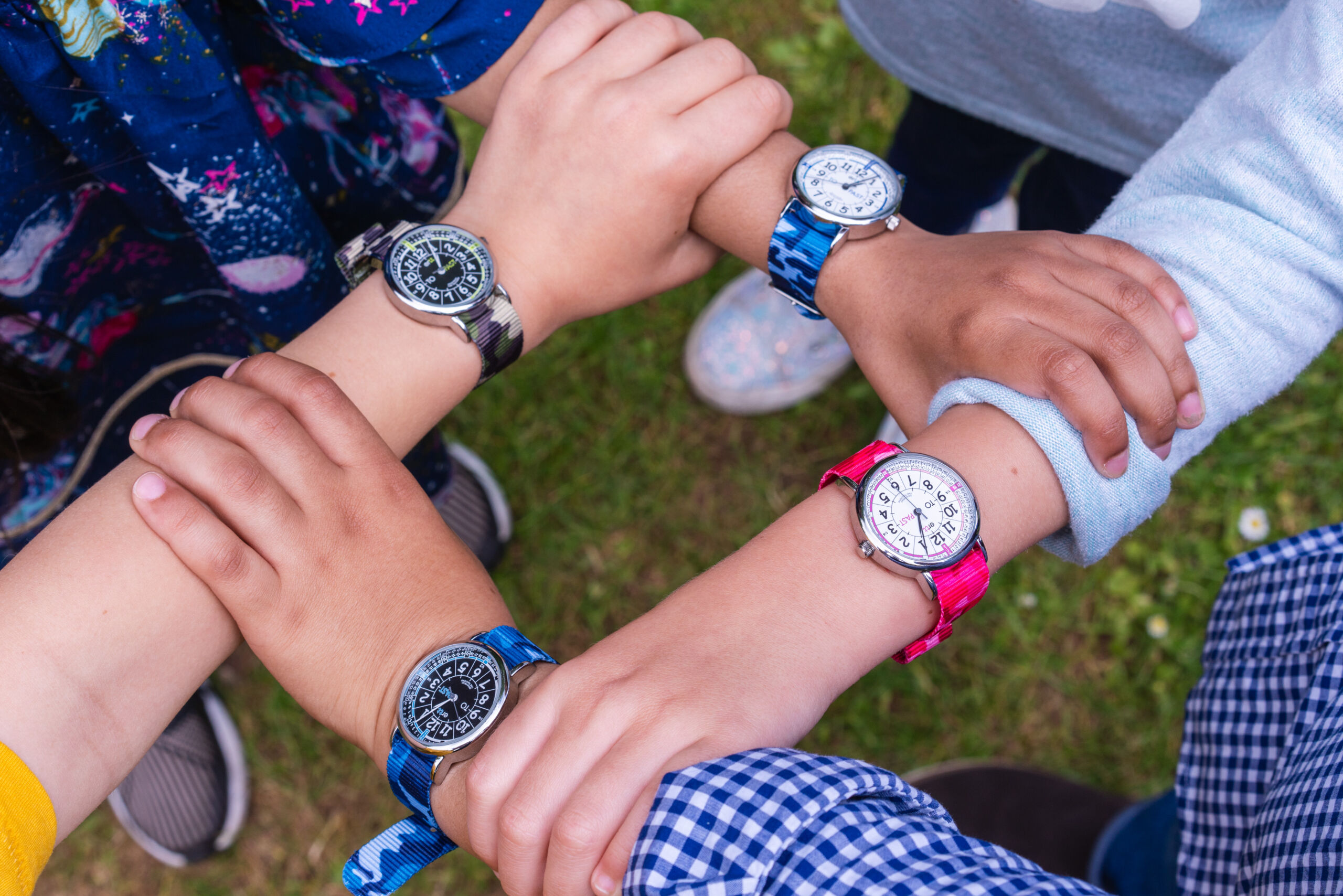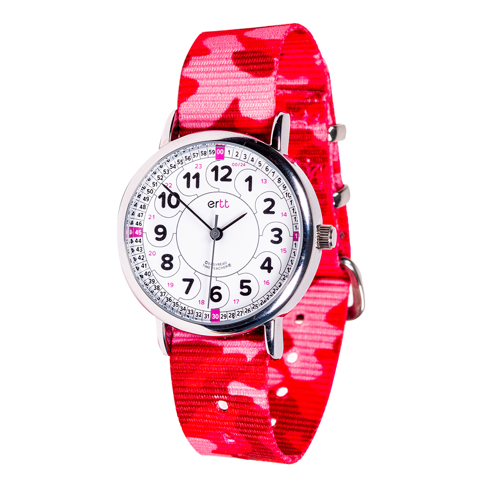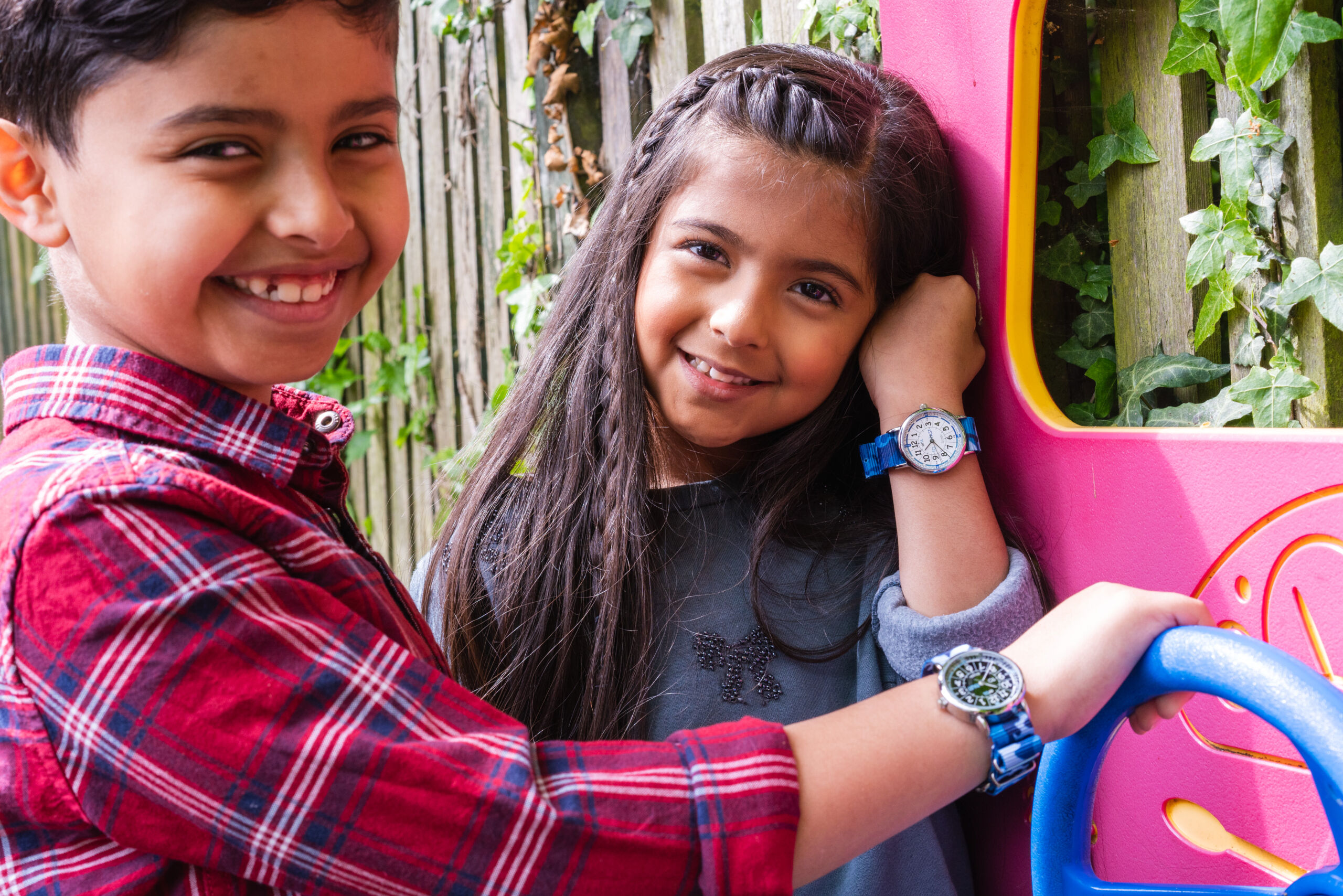The ideal first watch for children age 4+. The clear face design and simple teaching method make it really easy for children to learn to tell the time. Worn every day, your child will be able to practice their new skill wherever they go. The watch case is 33 mm (1.25 inch) in diameter and the dial is 28 mm diameter (1.125 inch).  Our watches are water resistant and can withstand splashing, but not total immersion. The washable nylon strap is 22.5 cm long and 16 mm wide.  It fits wrists from 12 cm to 18 cm circumference (small child to medium adult).