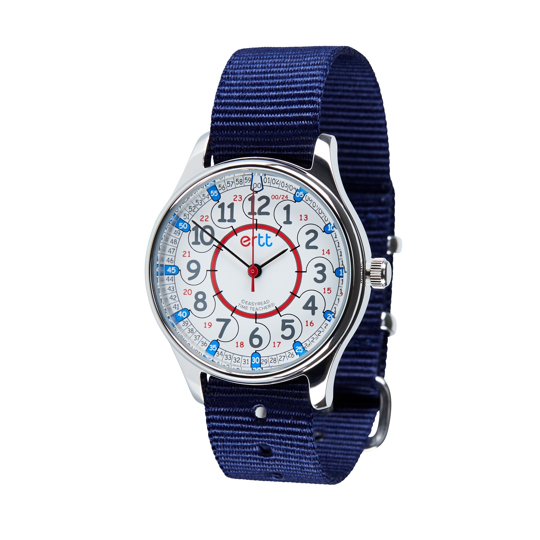 Waterproof watch, ideal for active children. The clear face design and simple teaching method make it easy to learn to tell the time – even in the swimming pool!  Worn every day, your child will be able to practice their new skill wherever they go. The stainless steel watch case has scratch-resistant glass and is 33 mm (1.25 inch) in diameter.  The watch dial is 28 mm diameter (1.125 inch).  The washable nylon strap is 22.5 cm long and 16 mm wide.  It fits wrists from 12 cm to 18 cm circumference (small child to medium adult). Suitable for all water-based activities, although not recommended to wear in a hot bath. Waterproof to 50m.