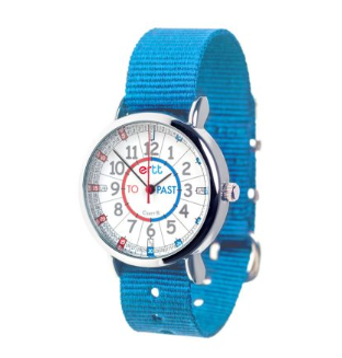 Featuring our popular ‘past and to’ method of learning to tell the time, this easy to read watch face comes complete with a bright blue strap, which is certain to appeal to both boys and girls.